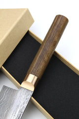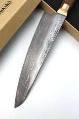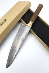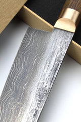 Klinge: Handgeschmiedeter Damast, 63 HRC, 215 mm