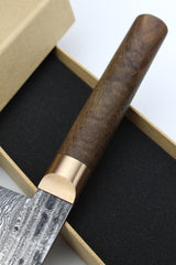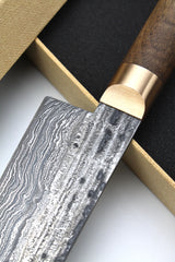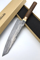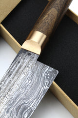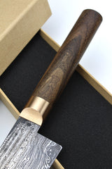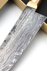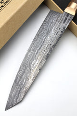 Klinge: Handgeschmiedeter Damast, 63 HRC, 215 mm