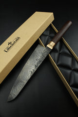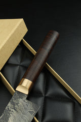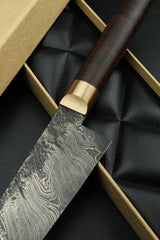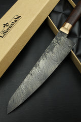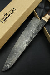 Klinge: Handgeschmiedeter Damast, 63 HRC, 215 mm