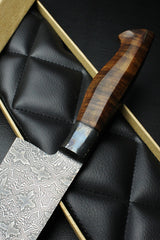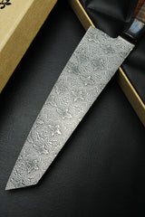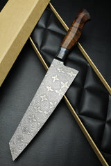 Das K-Tip Gyuto ist eine absolute Neuheit für Lilienstahl. Es ist das erste Integralmesser mit linear angeordneten und wiederholenden Sternen, die in einem einzigartigen Damaststahl eingebettet sind. Der Integrale Bolster zwischen Klinge und Griff zeigt einen dunkelblau bis grauen Stern. Das ganze Messer ist aus einem massiven Stück Damast gefertigt. Das Gyuto ist mit einer Klingendicke von 1,8 mm ein echtes Leichtgewicht. Die Sekundärschneidfase ist bei 2/10 der Klingendicke aufgebracht und verleiht dem Kochwerkzeug einen bissigen Schnitt und einen sehr geringen Schnittwiderstand.