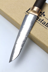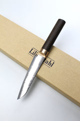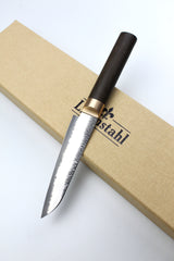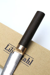 Glänzend durchziehen die Markstrahlen der tausende Jahre alten Mooreiche den Griff des Pettys. Nur der Geruch verrät die natürliche und ökologisch vertretbare Stabilisierung mit Lärchen und Fichtenharz gegen Feuchtigkeit und Gerüche. Die quer satinierte Zinnbronze bildet das Kernstück zwischen der San Mai 3LN Klinge und dem East Style Oval Griff ausgeführt als echte Zwinge. Die Diffusionszone zwischen dem Mantelmaterial und der Schneidlage der Klinge erlauben einen Einblick in das traditionelle Schmiedeverfahren.