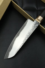Die Form Santoku beschreibt am besten unser mittelgroßes Allzweckmesser. Es ist für den Hackschnitt sowie den Wiegeschnitt ausgelegt. Der Dreilagenstahl wird in der japanischen San-Mai-Laminattechnik in unserer Manufaktur in Österreich von Hand geschmiedet. Dadurch erhält die dunkle und harte Schneidlage einen schützenden Mantel und macht das Messer perfekt für Gastronomie und Privathaushalte.