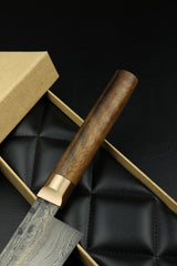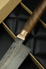 Klinge: Handgeschmiedeter Damast, 63 HRC, 180 mm